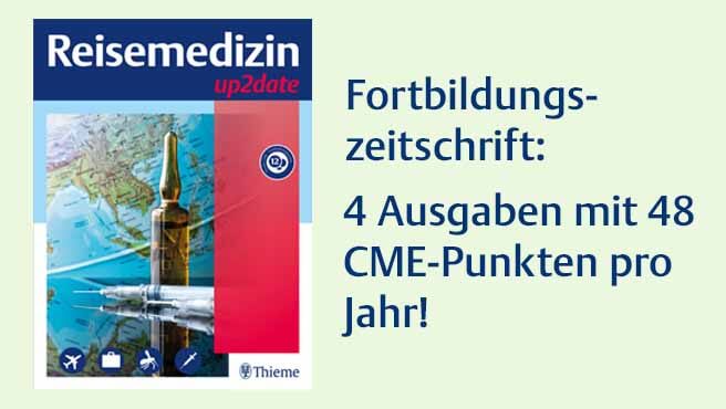 Wir freuen uns sehr, Ihnen die Fachzeitschrift Reisemedizin up2date mit vier Ausgaben pro Jahr vorstellen zu dürfen! Zusätzlich zu insgesamt 4 Fortbildungsbeiträgen liefert die Reisemedizin up2date mit jeder Ausgabe interessante Kurzrubriken: Studienreferate und die Rubrik „Update Impfungen“ zum schnellen Lesen zwischendurch, die Ihre Fachinhalte auf den Punkt bringen – verständlich und unmittelbar praxisrelevant.